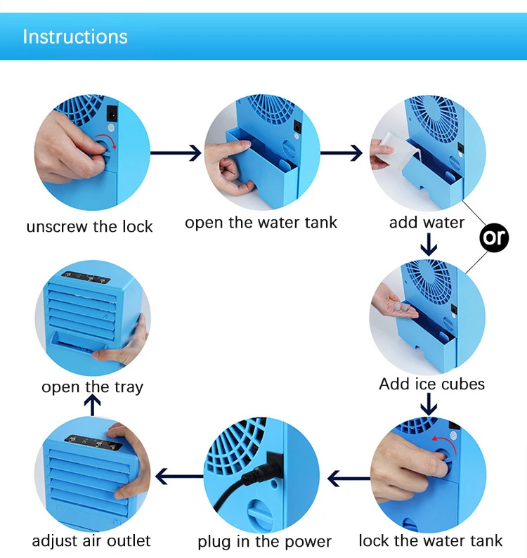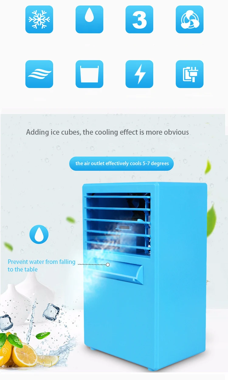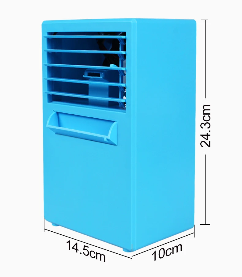 Remote Control Function: NoTiming Function: No TimingPower (W): 18wAir supply mode: OtherMax. Timing Limit: No TimingSuspender Length: No SuspenderReverse Rotating Function: NoWater-shortage Power-off Protection: YesWind Type: Natural WindMax. Power: <20WType: Cooling OnlyInstallation: MiniMaterial: PLASTICCertification: CEControlling Mode: Mechanical Timer ControlType: Air Cooling FanSize: >1400MMRotary Vane Quantity: 9Fan Speed: Third GearPower Source: ElectricApplication: 10-15㎡Technology: OtherUsage: HomeBrand Name: kbxstartVoltage (V): 24VColor: blue whiteSize: 14.5*10*24.3cmMaterials: ABSWeight: about 0.927kgSpeed style: Adjustable-three speeds(High/Medium/Low)Noise: Below 65dBSpray volume: 70ml/LSpray time: 4-6 hoursWater tank capacity: 420MLFeature: Evaporative Air CoolerSpecial features: Refrigeration, humidification, Steamed face, fresh air