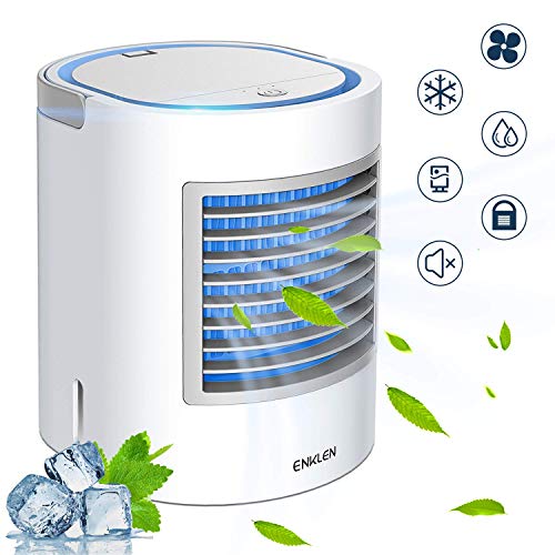- 【INSTANTLY & EFFICIENTLY COOLING】: Cooler than fan, and more energy saving than air conditioner, the ENKLEN portable air conditioner is born for cooling your hot summer! When the hot air go through the ice curtain soaked in ice water, it will be cooled 3-10℃ down. Only in 3s, the mini air cooler blows out the cool wind to you, what keeps your personal space at around 25℃ for about 6 hours.