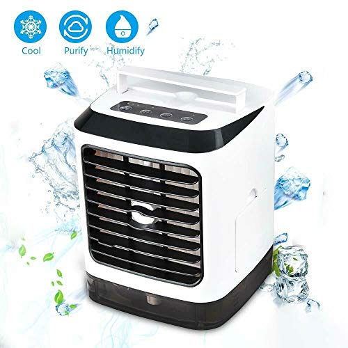 - Quiet Cooling Fan: Creative style, Made of high-quality abs,Has a solid structure and pressure-resistant.Safe to use. Apply to office, Pram, Camping,Bed etc. Put ice cube into the water tank,The wind will be more cooler. Provide a variety of operating modes,Such as cooling,Dehumidification,Fan and sleep mode.