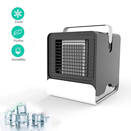 - PERSONAL AIR COOLER: Add some water & ice cube in the water tank, water absorbs heat from the air and evaporates, causing the air temperature to drop, the fan blows out cooling wind to cool you down instantly.